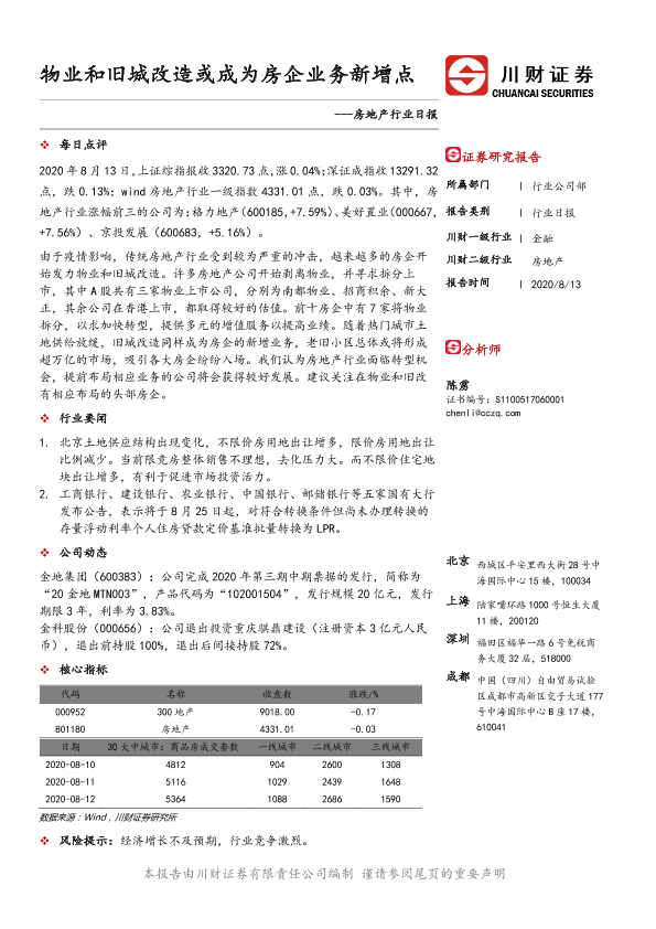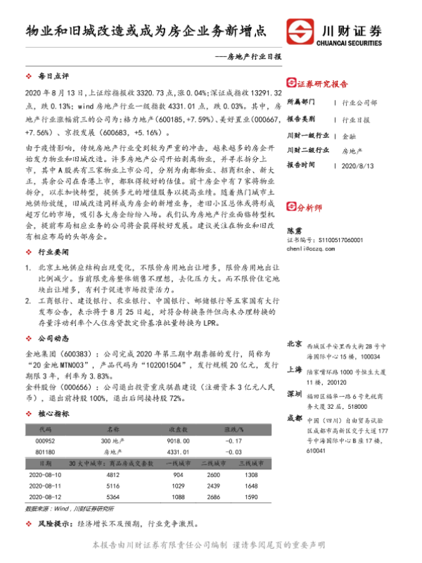 【川财证券】【20200813】房地产行业日报:物业和旧城改造或成为房企业务新增点-3页