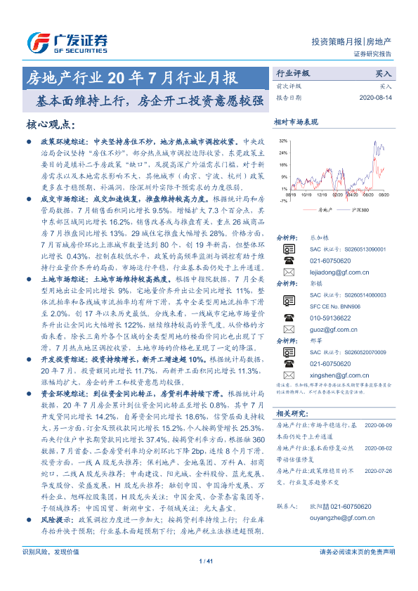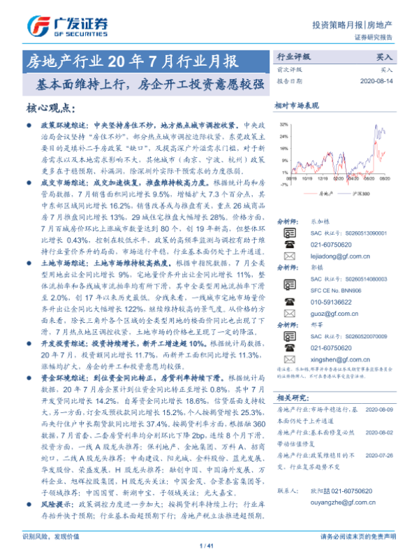 【广发证券】【20200814】房地产行业20年7月行业月报:基本面维持上行,房企开工投资意愿较强-41页