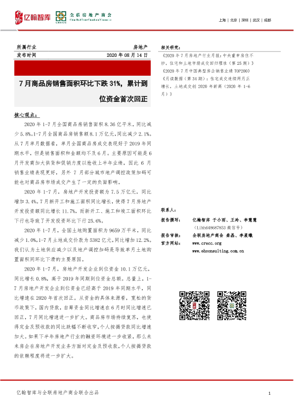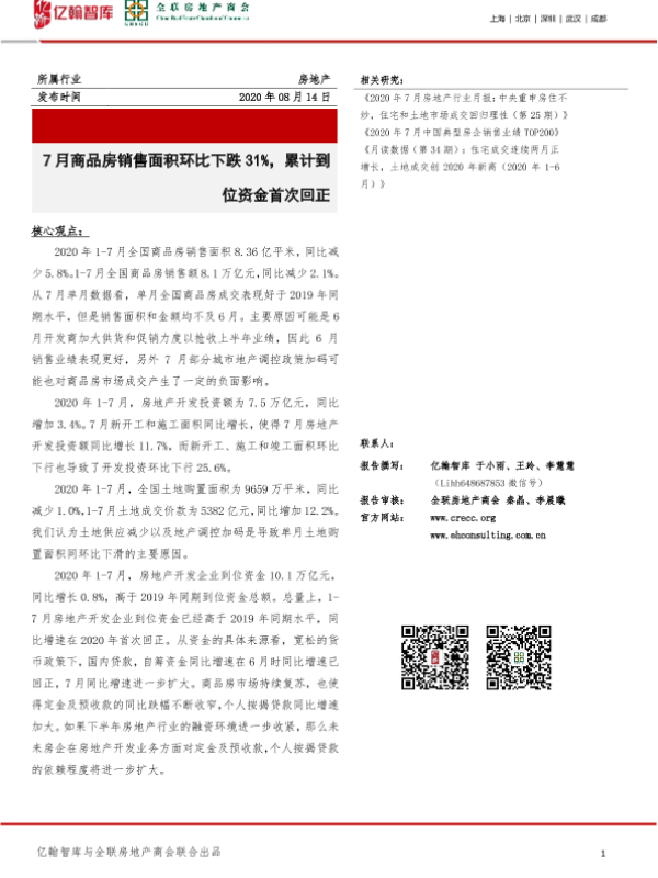 【亿翰智库与全联房地产商会】【20200814】7月商品房销售面积环比下跌31%,累计到位资金首次回正-13页