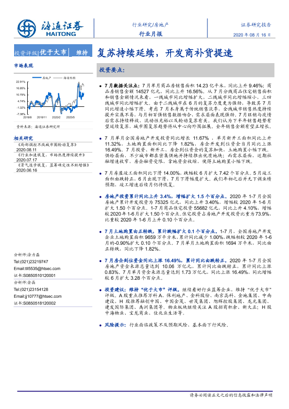 【海通证券】【20200816】房地产行业月报:复苏持续延续,开发商补货提速-13页
