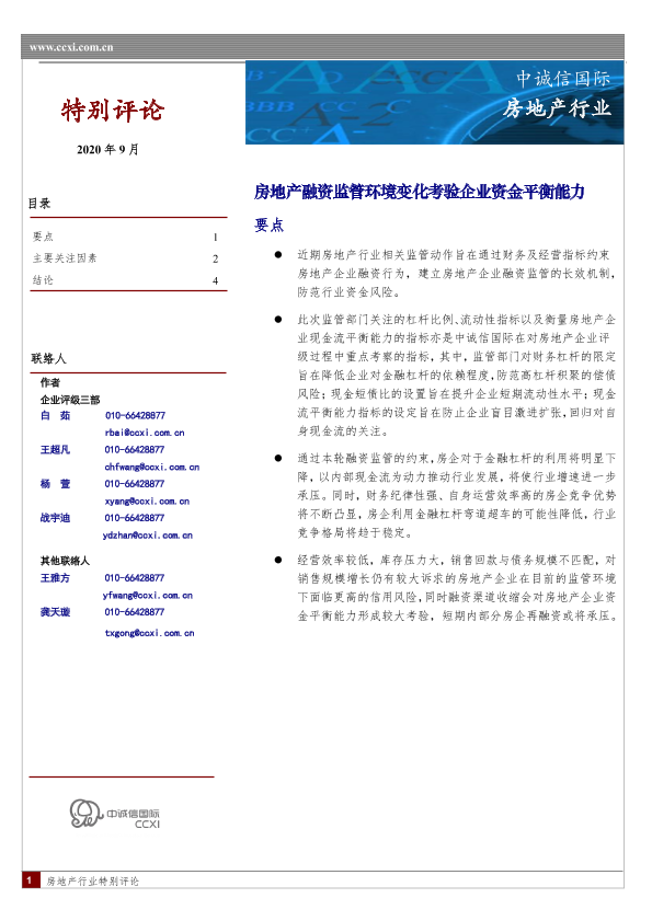 【中诚信国际】【202009】房地产融资监管环境变化考验企业资金平衡能力-5页