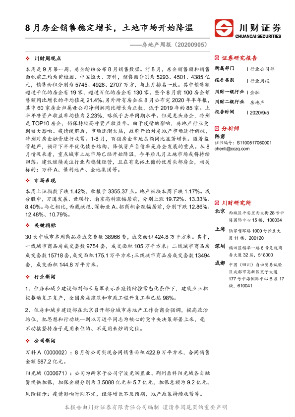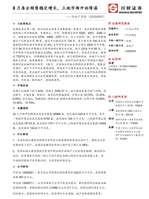 【川财证券】【20200905】8月房企销售稳定增长,土地市场开始降温-10页