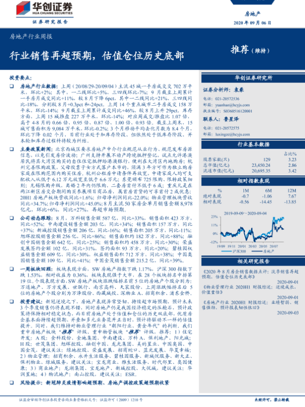 【华创证券】【20200906】房地产行业周报:行业销售再超预期,估值仓位历史底部-23页