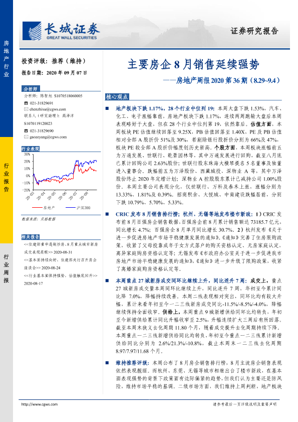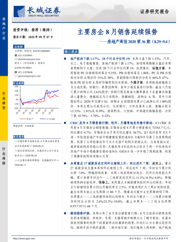 【长城证券】【20200907】主要房企8月销售延续强势-15页