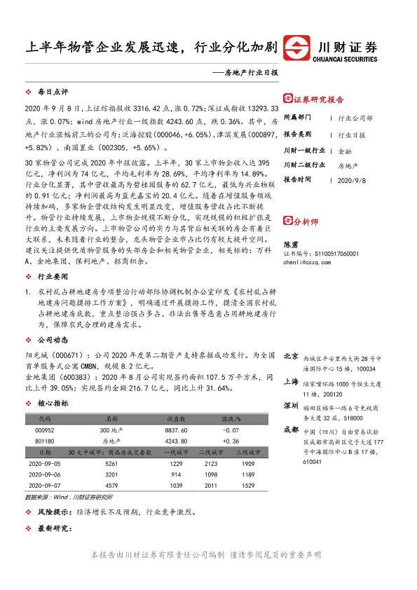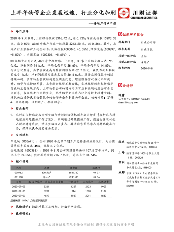 【川财证券】【20200908】房地产行业日报:上半年物管企业发展迅速,行业分化加剧-3页