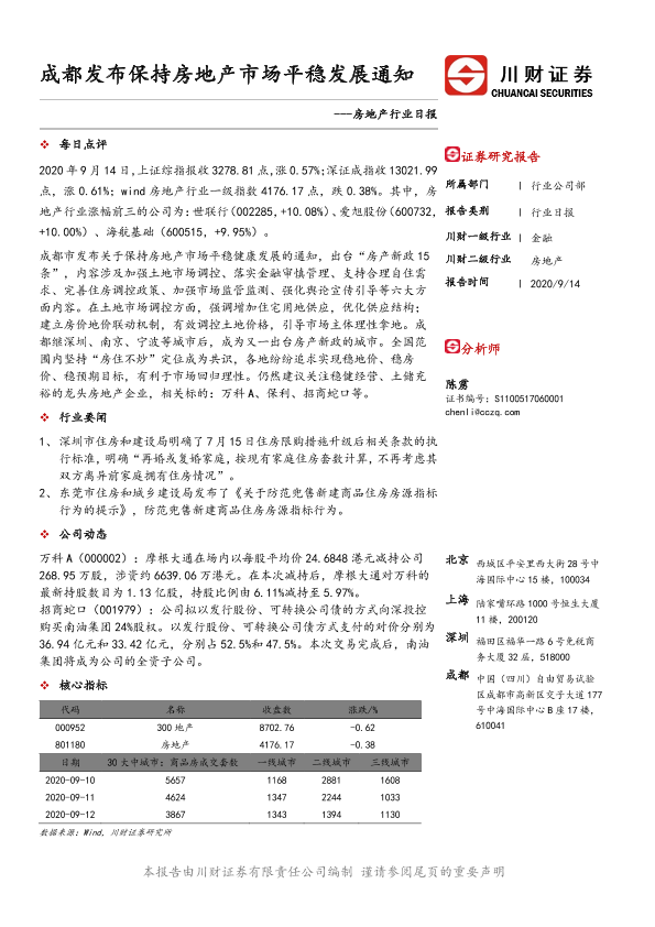 【川财证券】【20200914】成都发布保持房地产市场平稳发展通知-3页