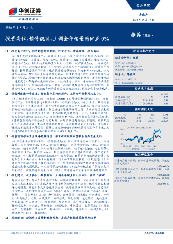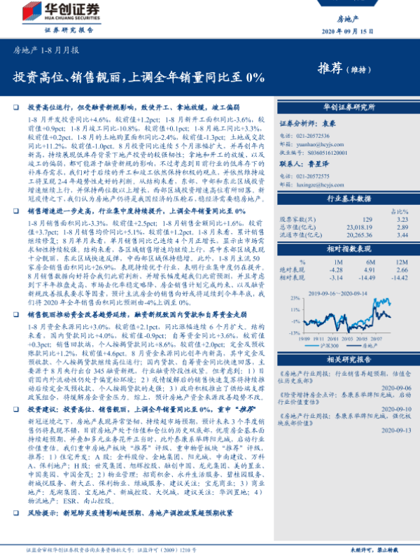 【华创证券】【20200915】房地产1-8月月报:投资高位、销售靓丽,上调全年销量同比至0%-12页