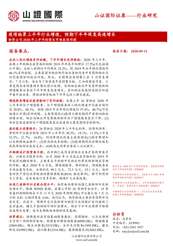【山证国际证券】【20200915】物管公司2020年上半年经营及市场表现回顾-24页