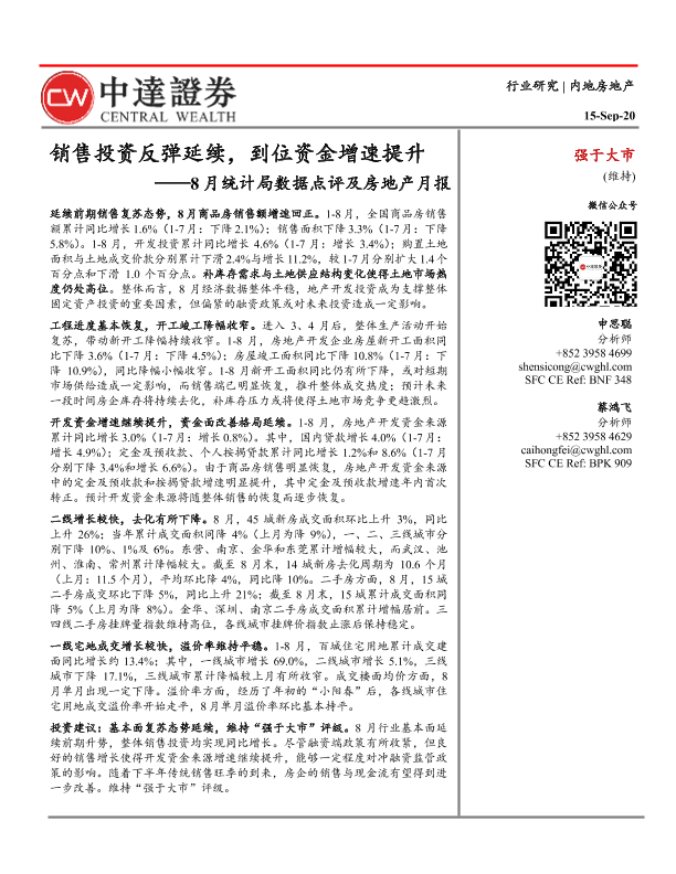 【中达证券】【20200915】8月统计局数据点评及房地产月报:销售投资反弹延续,到位资金增速提升-25页