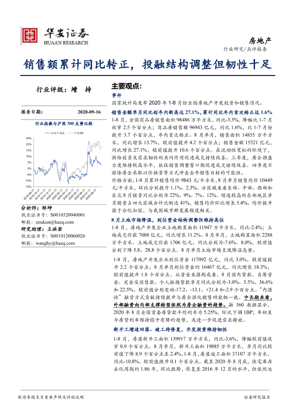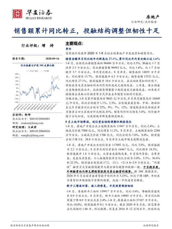 【华安证券】【20200916】房地产点评报告:销售额累计同比转正,投融结构调整但韧性十足-3页