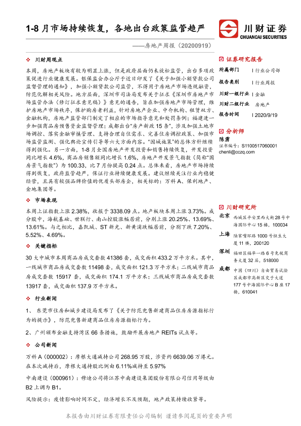 【川财证券】【20200919】1-8月市场持续恢复,各地出台政策监管趋严-10页