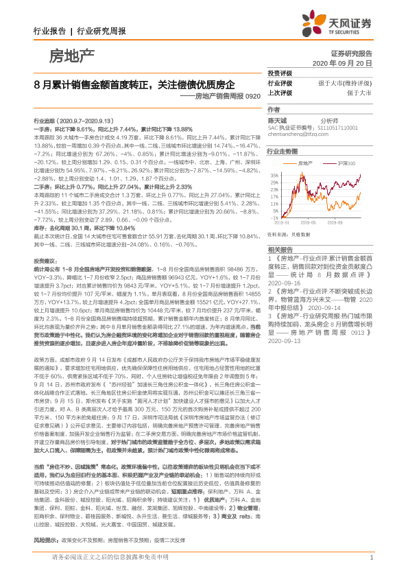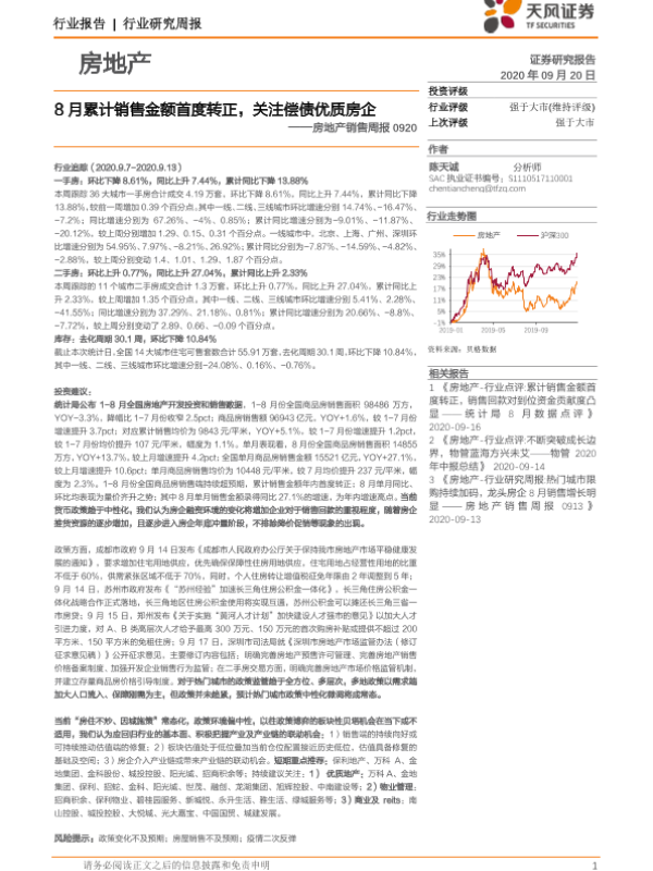 【天风证券】【20200920】8月累计销售金额首度转正,关注偿债优质房企-12页