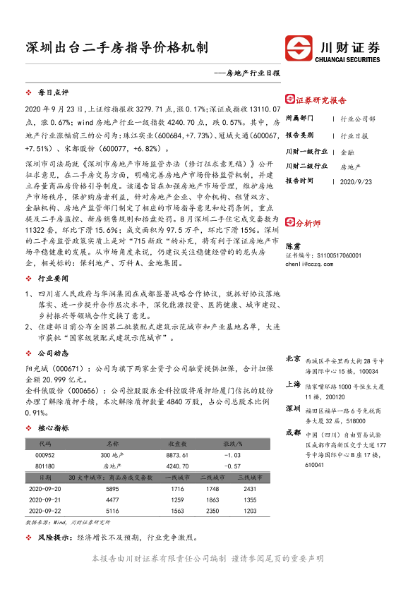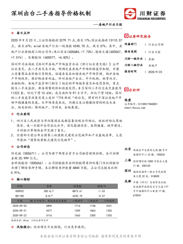 【川财证券】【20200923】房地产行业日报:深圳出台二手房指导价格机制-3页
