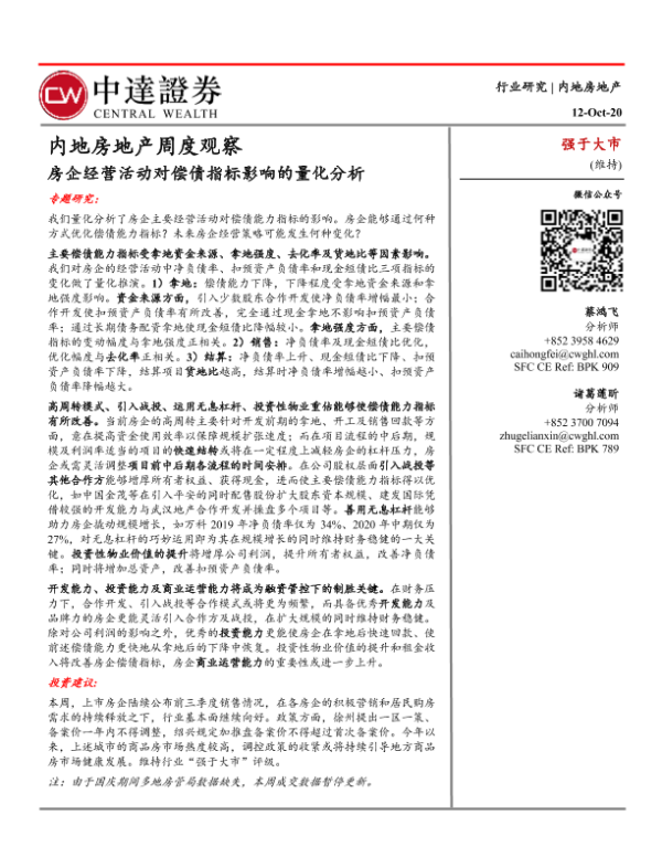 【中达证券】【20201012】内地房地产周度观察:房企经营活动对偿债指标影响的量化分析-22页
