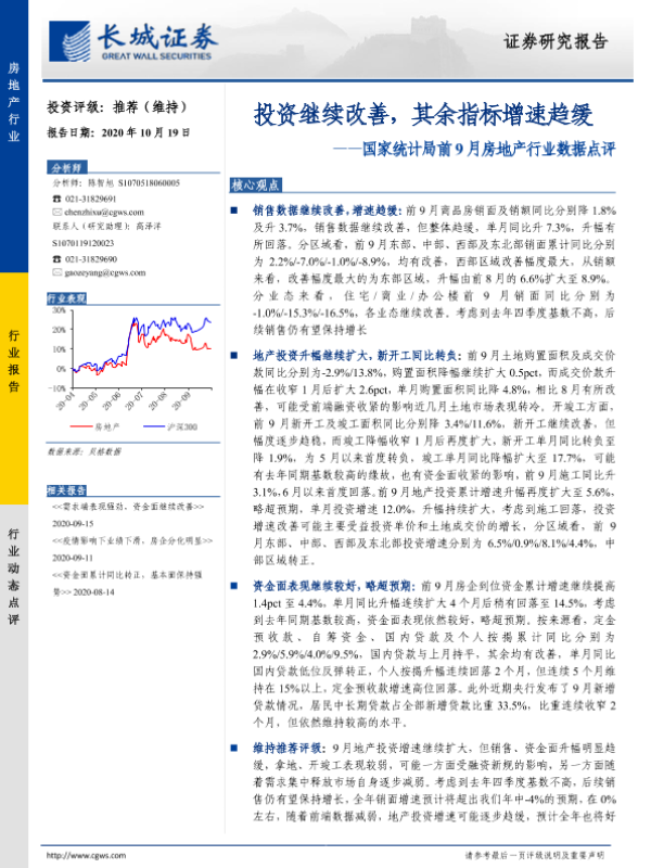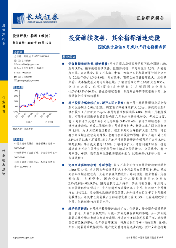【长城证券】【20201019】国家统计局前9月房地产行业数据点评:投资继续改善,其余指标增速趋缓-9页