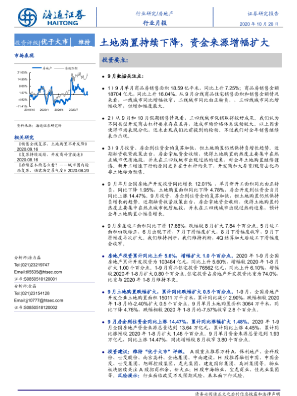 【海通证券】【20201020】房地产行业月报:土地购置持续下降,资金来源增幅扩大-12页