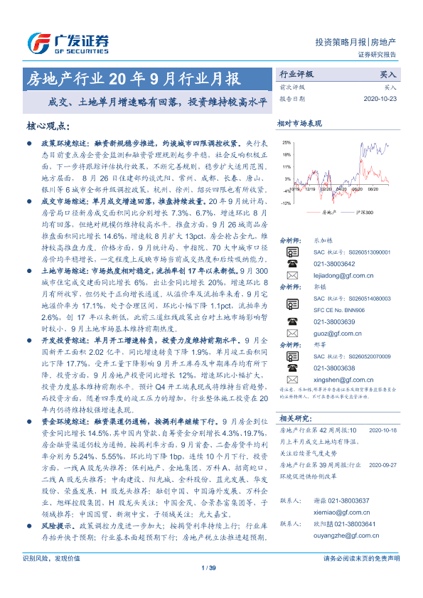 【广发证券】【20201023】房地产行业20年9月行业月报:成交、土地单月增速略有回落,投资维持较高水平-39页