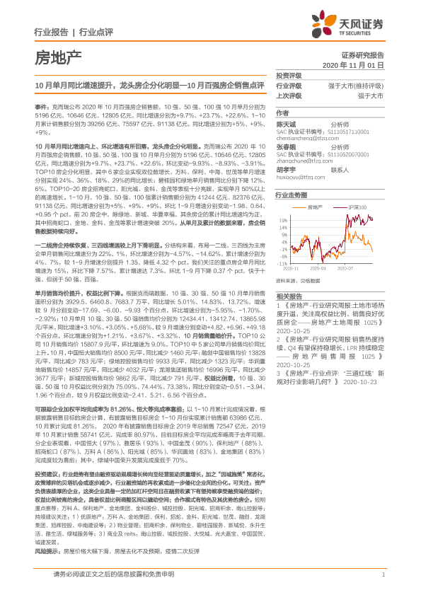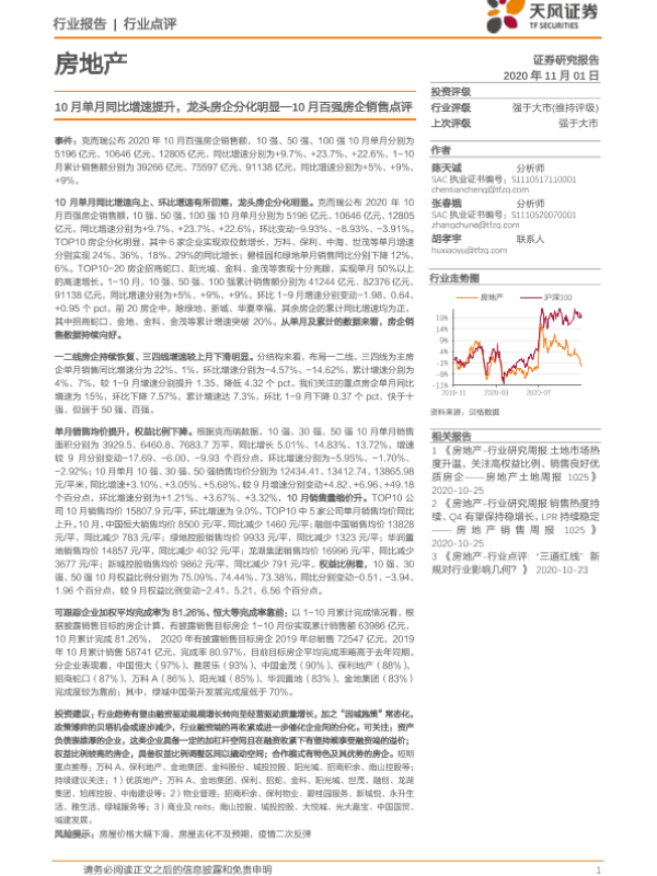 【天风证券】【20201101】10月百强房企销售点评:10月单月同比增速提升,龙头房企分化明显-3页