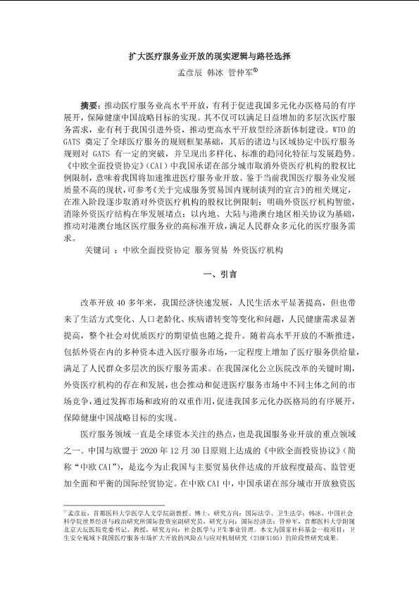 健康中国战略 医疗服务 国际经贸规则 外资医疗机构 对外开放