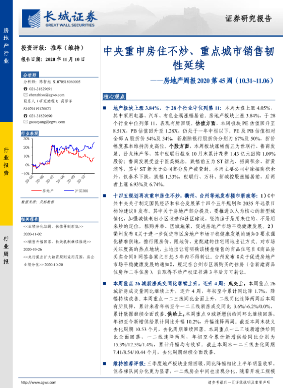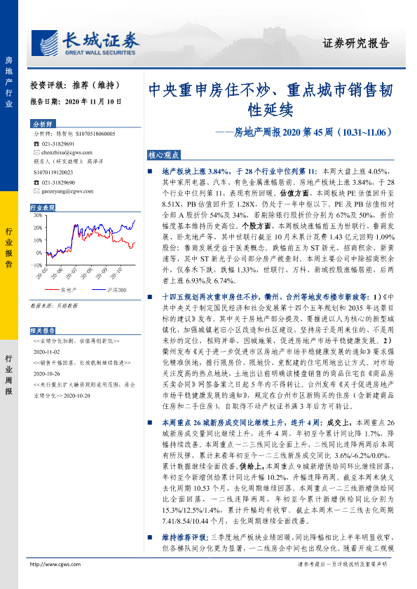 【长城证券】【20201110】中央重申房住不炒、重点城市销售韧性延续-15页