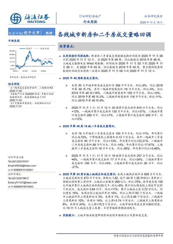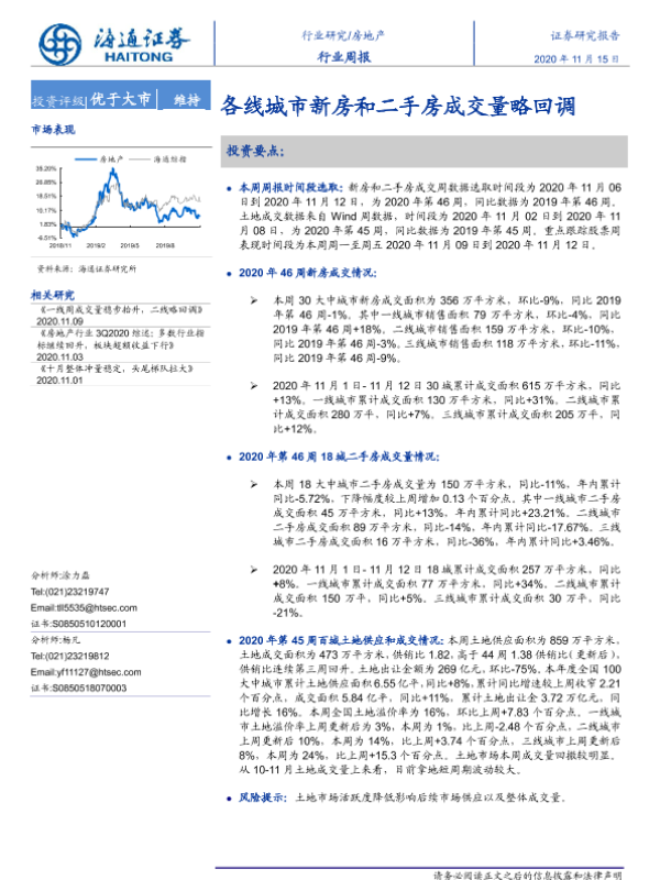 【海通证券】【20201115】房地产行业周报:各线城市新房和二手房成交量略回调-6页
