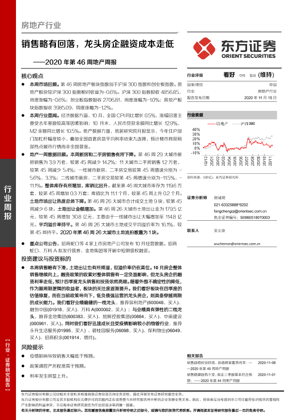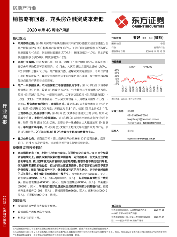 【东方证券】【20201115】2020年第46周地产周报:销售略有回落,龙头房企融资成本走低-16页