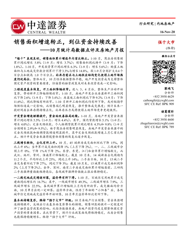 【中达证券】【20201116】10月统计局数据点评及房地产月报:销售面积增速转正,到位资金持续改善-25页