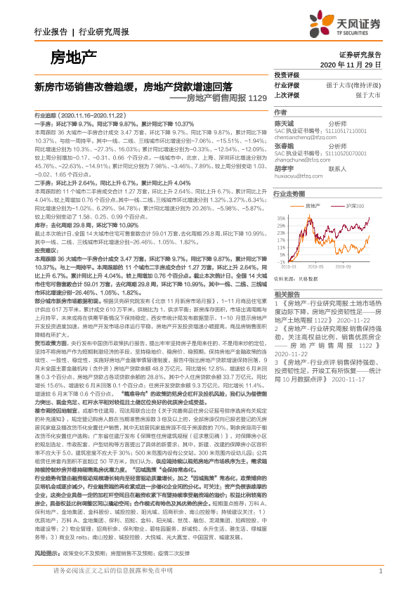 【天风证券】【20201129】新房市场销售改善趋缓,房地产贷款增速回落-13页