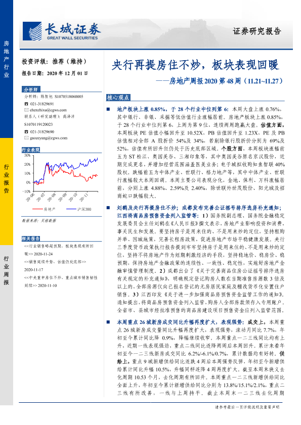 【长城证券】【20201201】房地产周报2020第48周:央行再提房住不炒,板块表现回暖-14页