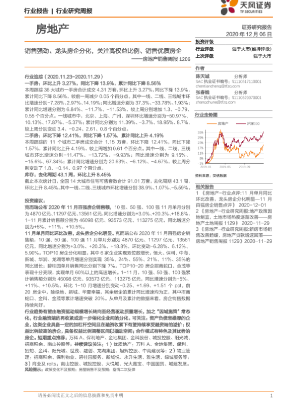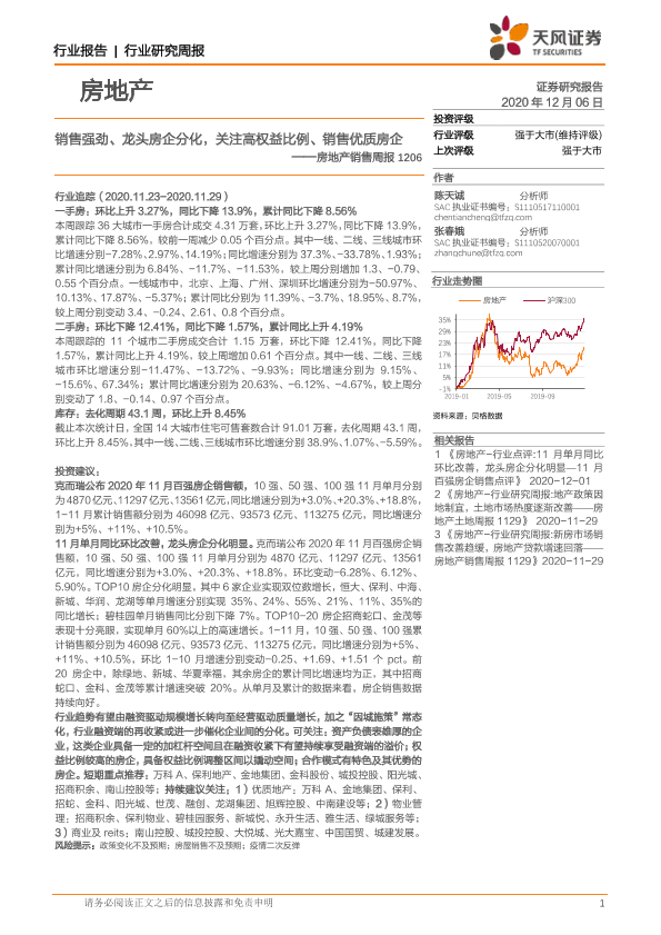 【天风证券】【20201206】房地产销售周报:销售强劲、龙头房企分化,关注高权益比例、销售优质房企-12页