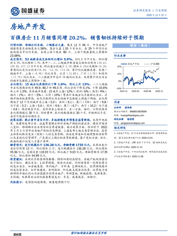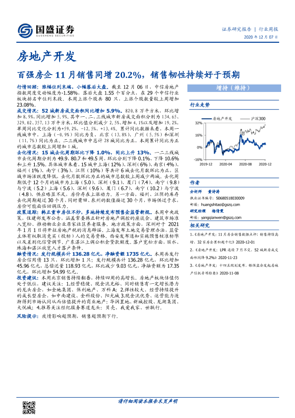 【国盛证券】【20201207】房地产开发行业周报:百强房企11月销售同增20.2%,销售韧性持续好于预期-19页