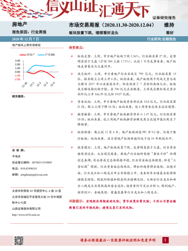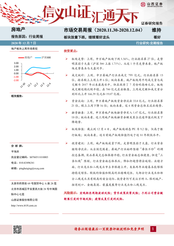 【山西证券】【20201207】房地产市场交易周报:板块放量下跌,继续看好龙头-20页
