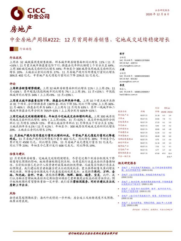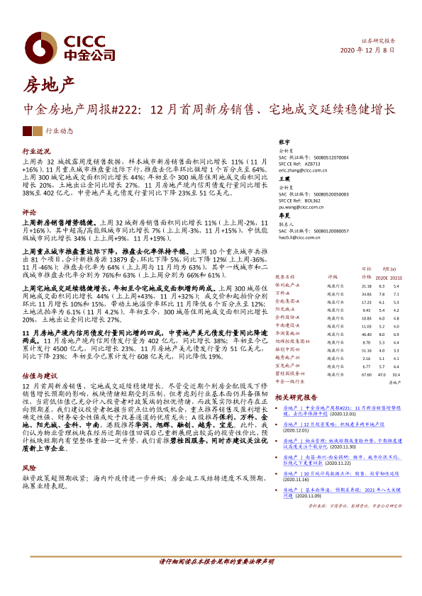 【中金公司】【20201208】12月首周新房销售、宅地成交延续稳健增长-12页