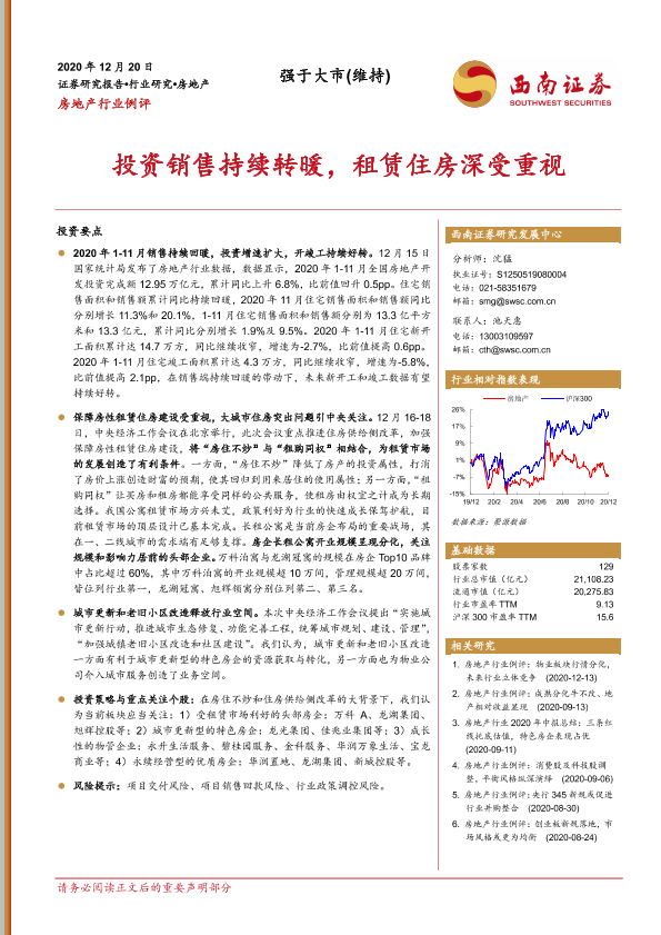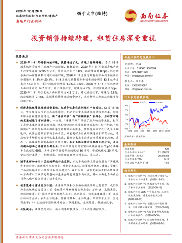 【西南证券】【20201220】房地产行业例评:投资销售持续转暖,租赁住房深受重视-13页