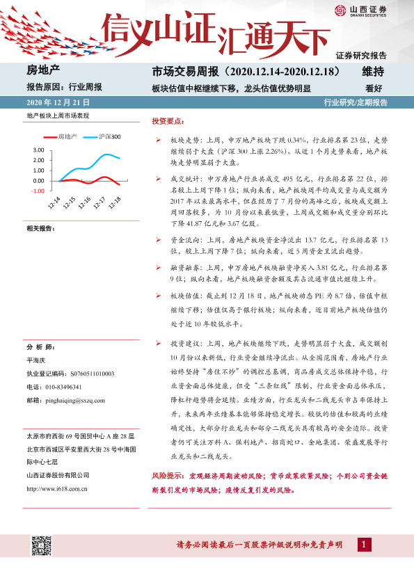 【山西证券】【20201221】房地产市场交易周报:板块估值中枢继续下移,龙头估值优势明显-20页