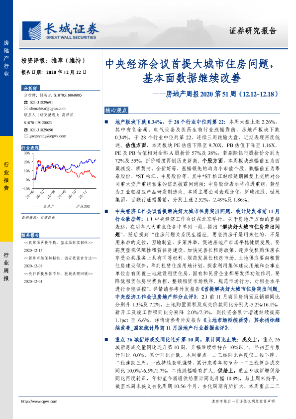 【长城证券】【20201222】房地产周报2020第51周:中央经济会议首提大城市住房问题,基本面数据继续改善-15页
