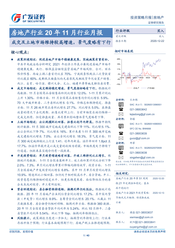 【广发证券】【20201222】房地产行业20年11月行业月报:成交及土地市场维持较高增速,景气度略有下行-40页