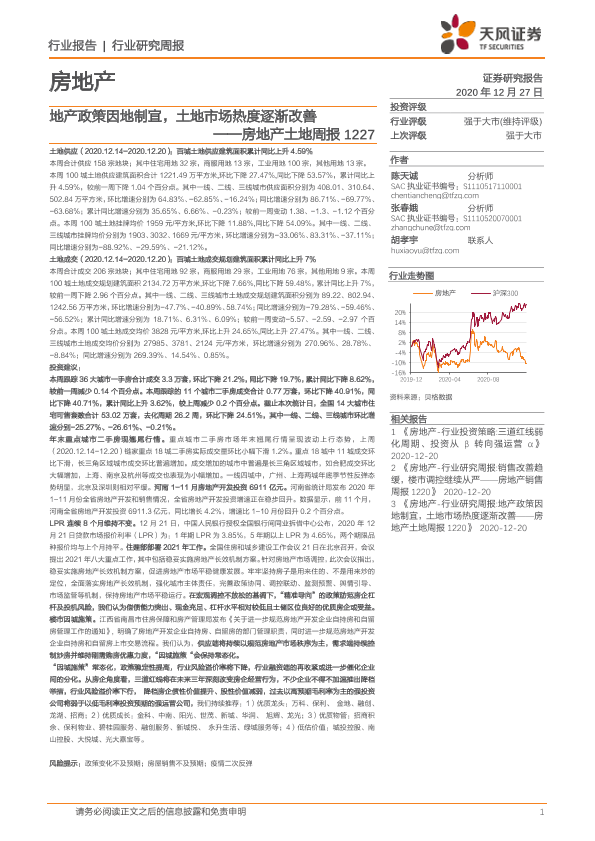【天风证券】【20201227】地产政策因地制宜,土地市场热度逐渐改善-10页