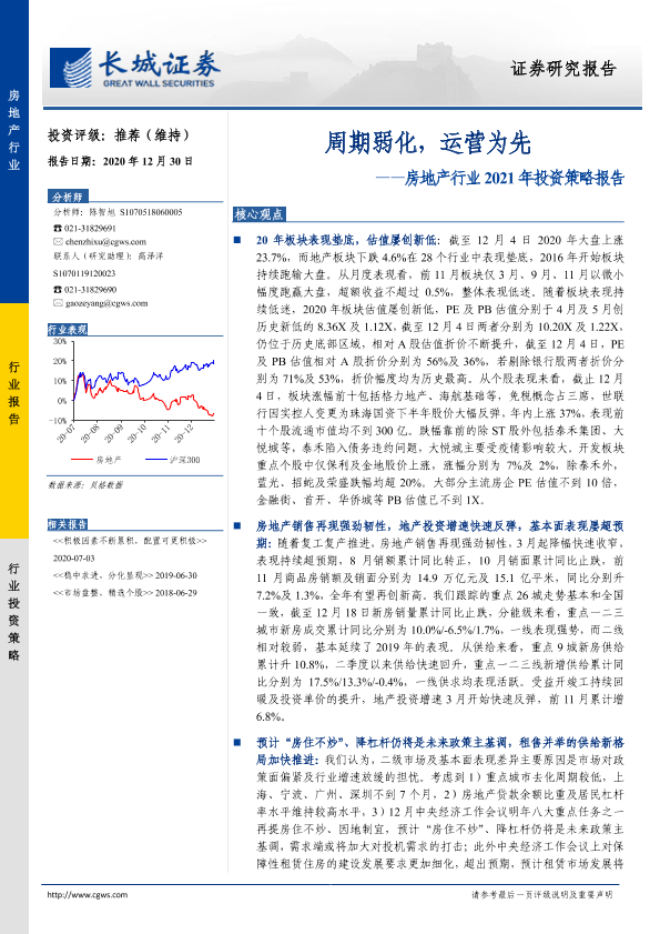 【长城证券】【20201230】房地产行业2021年投资策略报告:周期弱化,运营为先-32页
