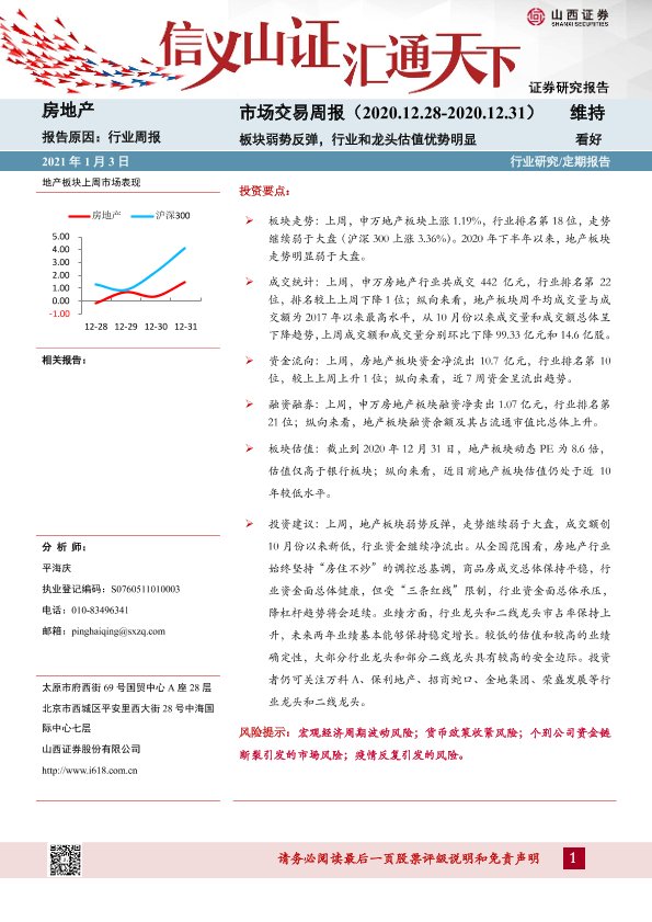 【山西证券】【20210103】房地产行业周报:板块弱势反弹,行业和龙头估值优势明显-20页