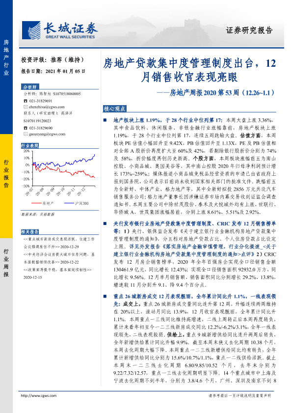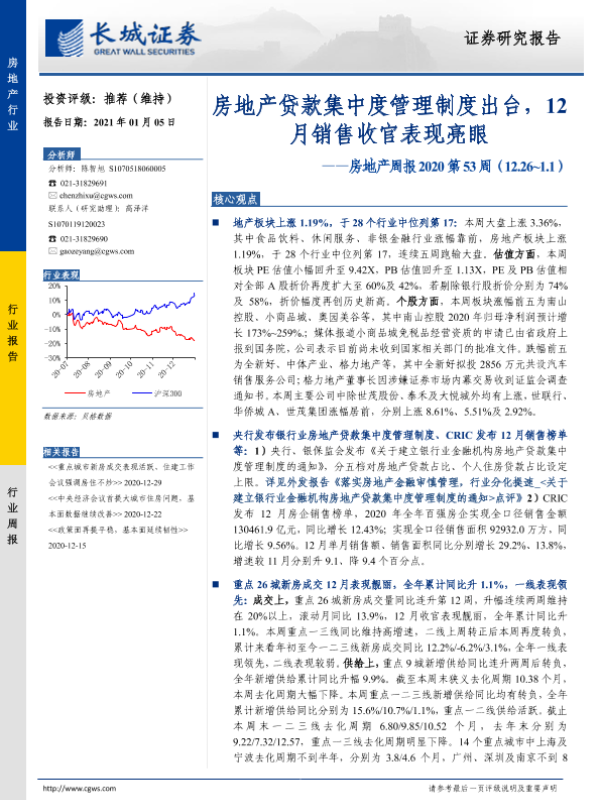 【长城证券】【20210105】房地产周报2020第53周:房地产贷款集中度管理制度出台,12月销售收官表现亮眼-15页