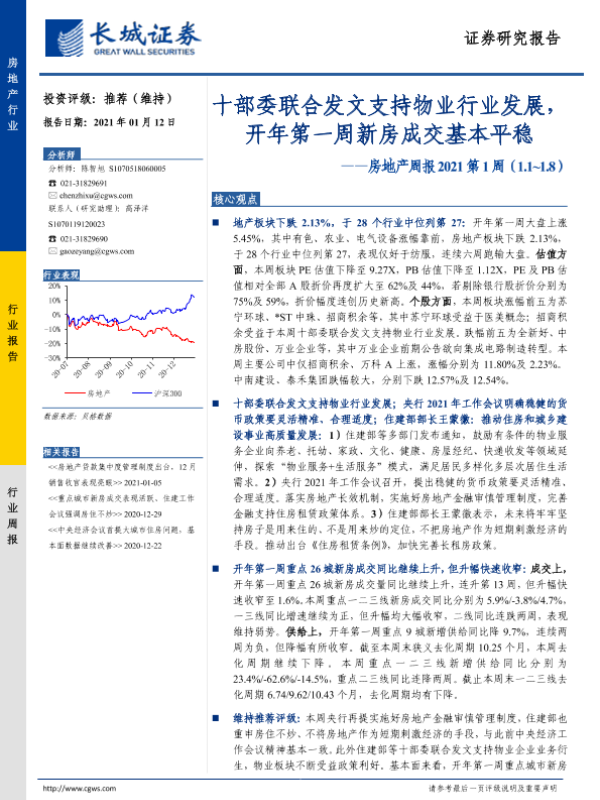 【长城证券】【20210112】房地产周报2021第1周:十部委联合发文支持物业行业发展,开年第一周新房成交基本平稳-16页