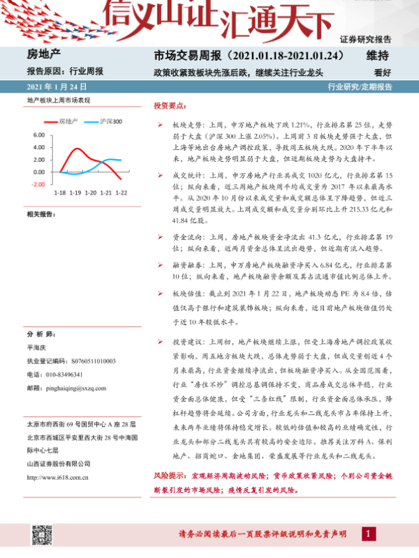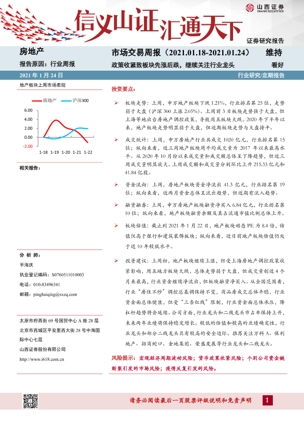 【山西证券】【20210124】房地产市场交易周报:政策收紧致板块先涨后跌,继续关注行业龙头-20页