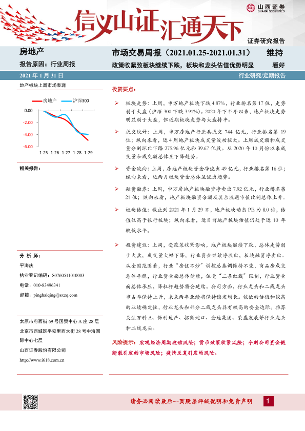 【山西证券】【20210131】房地产市场交易周报:政策收紧致板块继续下跌,板块和龙头估值优势明显-20页