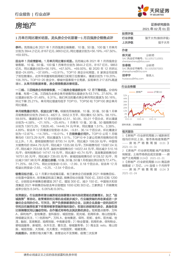 【天风证券】【20210201】1月单月同比增长明显,龙头房企分化显著—1月百强房企销售点评-3页
