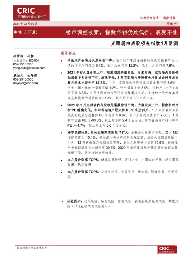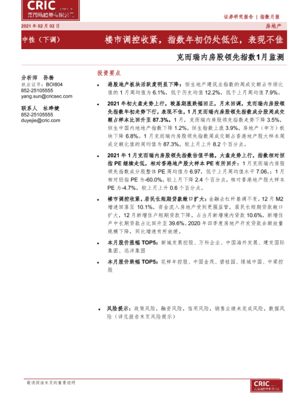 【克而瑞证券】【20210202】克而瑞内房股领先指数1月监测:楼市调控收紧,指数年初仍处低位,表现不佳-11页