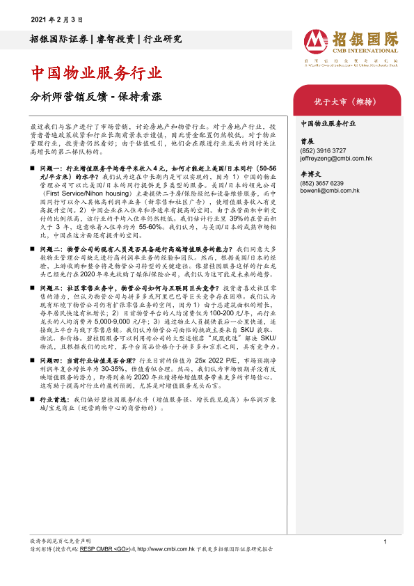 【招银国际证券】【20210203】中国物业服务行业:分析师营销反馈-保持看涨-2页