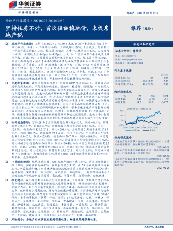 【华创证券】【20210307】房地产行业周报:坚持住房不炒,首次强调稳地价,未提房地产税-21页