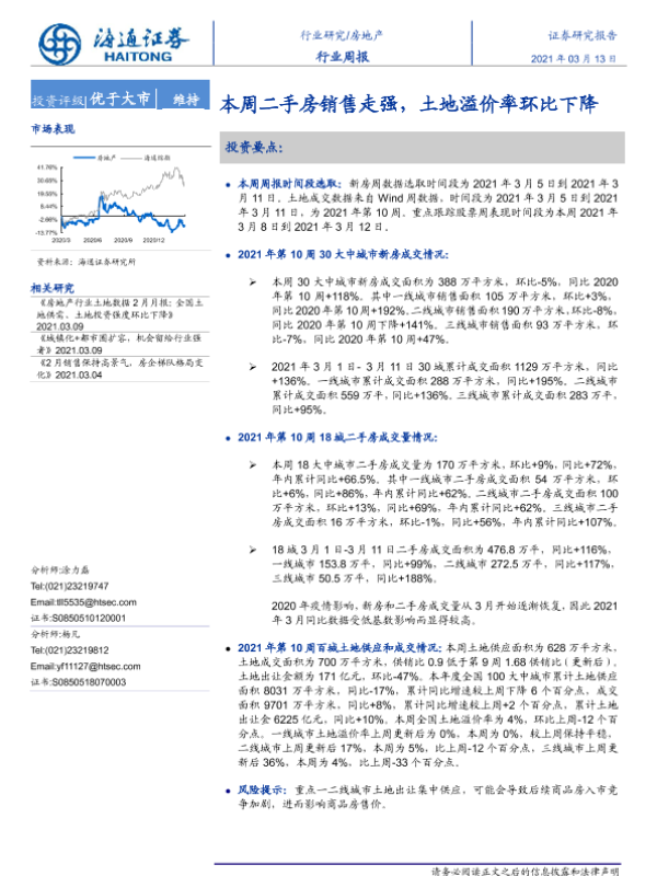 【海通证券】【20210313】房地产行业周报:本周二手房销售走强,土地溢价率环比下降-6页