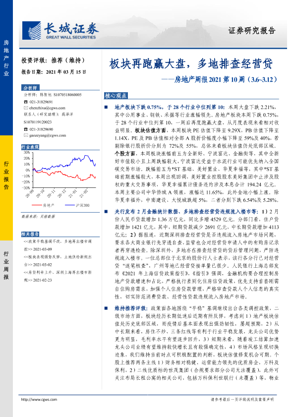 【长城证券】【20210315】房地产周报2021第10周:板块再跑赢大盘,多地排查经营贷-14页